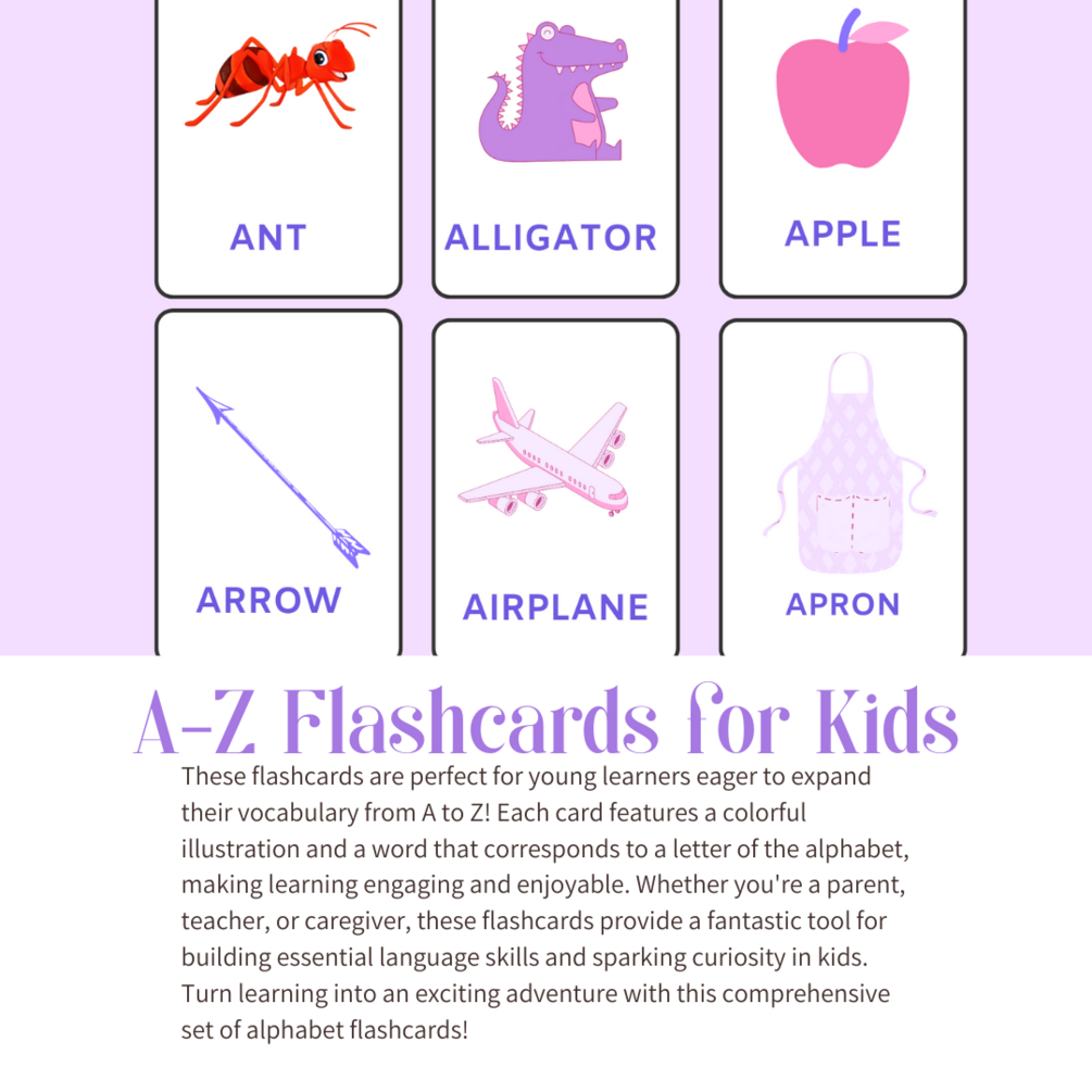 These flashcards are perfect for young learners eager to expand their vocabulary from A to Z! Each card features a colorful illustration and a word that corresponds to a letter of the alphabet, making learning engaging and enjoyable. Whether you're a parent, teacher, or caregiver, these flashcards provide a fantastic tool for building essential language skills and sparking curiosity in kids. Turn learning into an exciting adventure with this comprehensive set of alphabet flashcards!